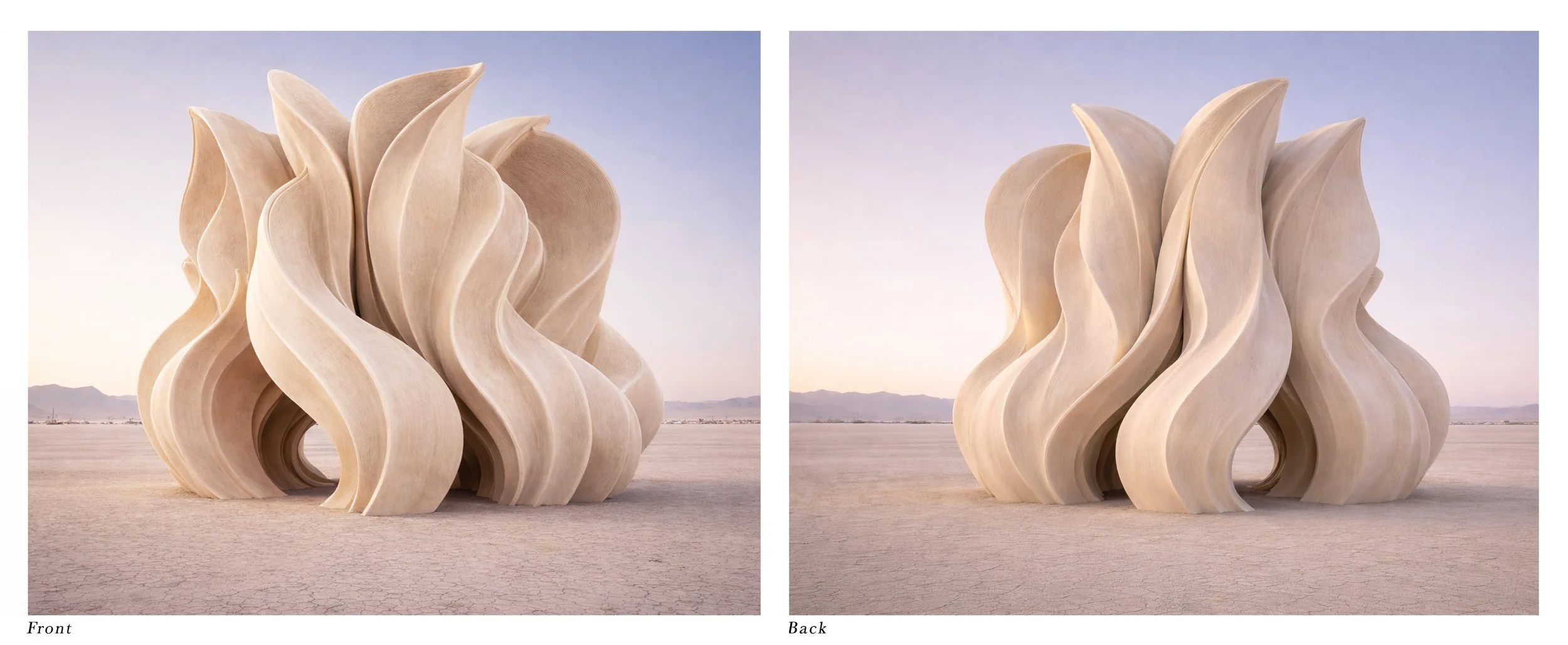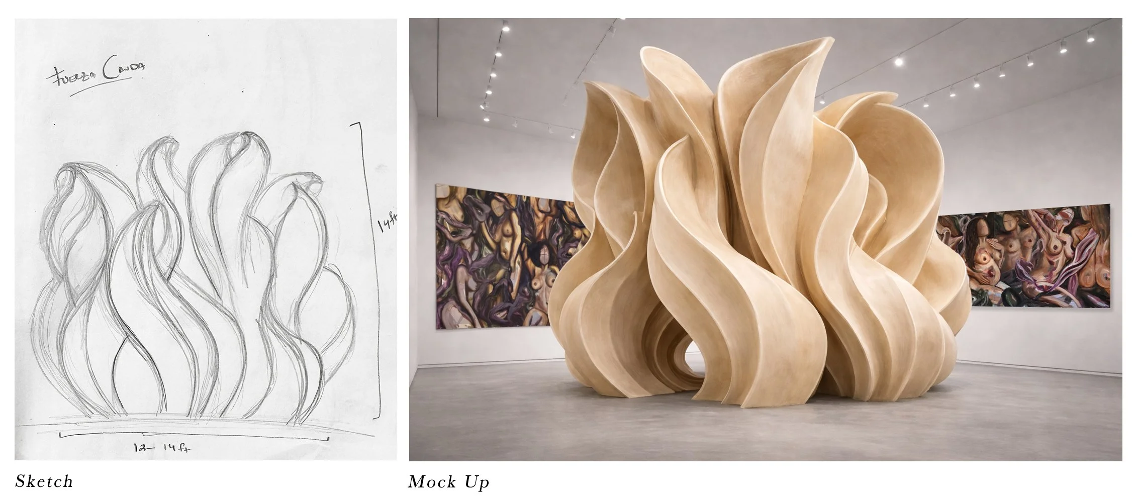 Fuerza Cruda is a multisensorial scultpure designed to be felt through the body before it is understood by the mind. Participants are invited to physically and emotionally experience the work, weaving through 14-foot pillars and leaning into the raw, sensual curves. The scale creates an environment of spatial curiosity and intimacy where visitors can feel the grounded, visceral power of the feminine.